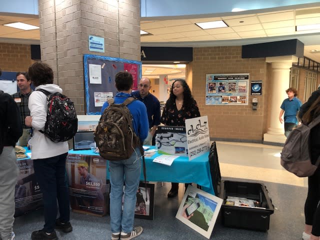 (pictured left to right) Angel Advanced Technologies, pictured are Matt & Traci Florez and they talked to the students about the Electrical Trade, complete with a Drone. Storm Coast Homes-Dave Stormont & Neal Contracting Group-Matt Neal talked to the students about the Construction Industry as a whole and the importance of looking into a Trade. One Hour Heating & Air Conditioning, Ron Seidman & Butch Hill represented the HVAC Industry and talked to the students on the different aspects of going into the HVAC business.